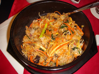 Dolsot bibimbap (rice, meat and veggies in a HOT stone pot): The before picture.